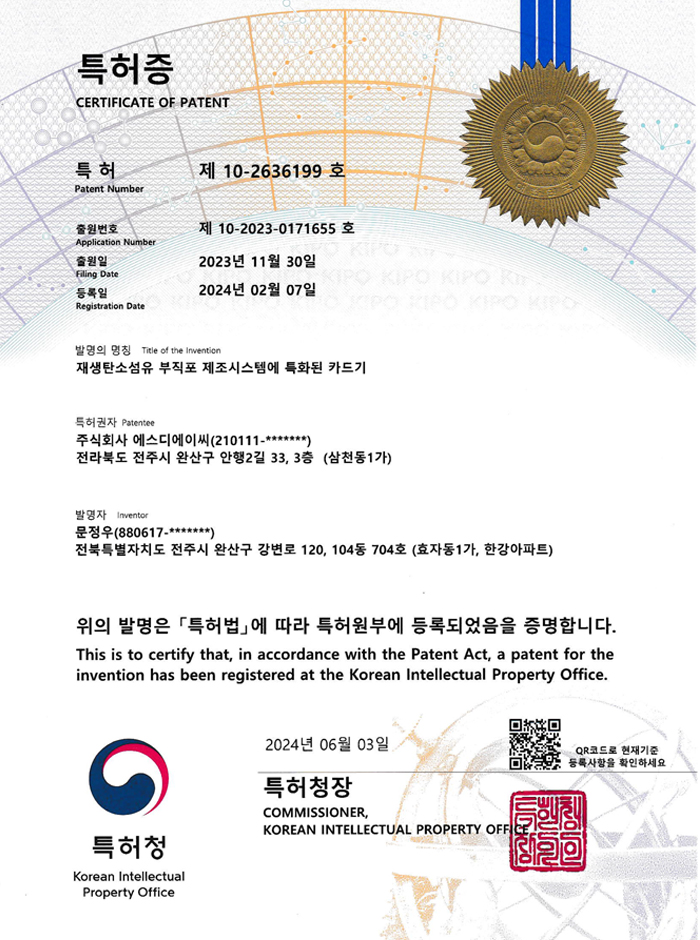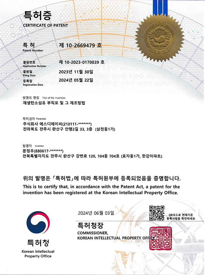 Our company's recycled carbon fiber nonwoven fabric manufacturing technology is protected by Patent No. 10-2636199